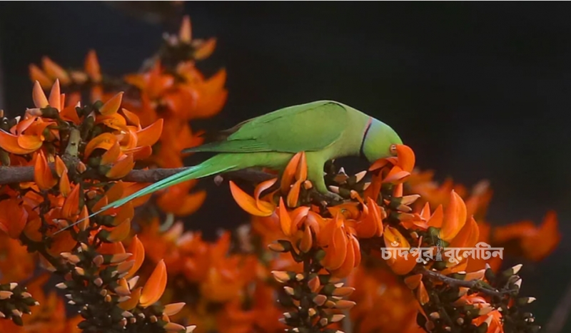 চারদিকে ফুলের সুবাস ও কোকিলের কুহু কুহু ডাকই বলে দেয় বসন্ত এসে গেছে। প্রকৃতিকে রাঙিয়ে গাছে গাছে ফোটা পলাশ ফুলে বসে সবুজ টিয়া।